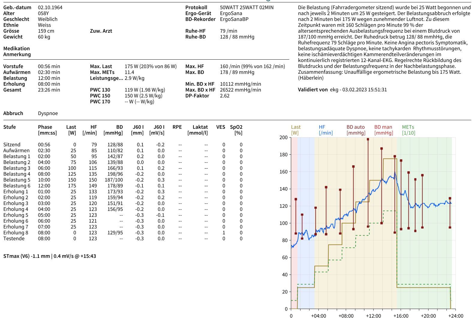 Die Spiroergometrie ist ein diagnostisches Verfahren bei dem durch Messung von Atemgasen (Sauerstoff und Kohlendioxid), ggf. unterstützt durch die Laktat-Bestimmung im Kapillarblut (aus dem Ohrläppchen gewonnen) während körperlicher Belastung die Reaktion von Herz, Kreislauf, Atmung und Stoffwechsel sowie die kardiopulmonale Leistungsfähigkeit qualitativ und quantitativ untersucht wird.