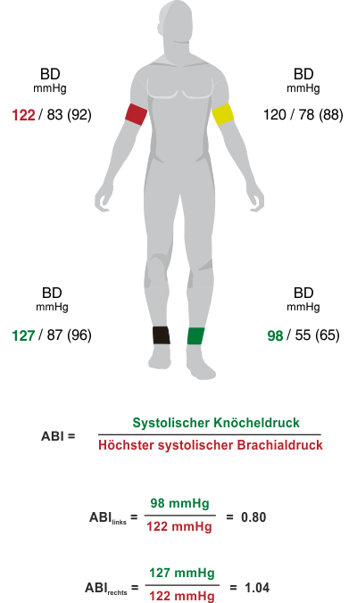 ABI steht für Ankle-Brachial-Index (Knöchel-Arm-Index). Die ABI-Messung ist eine einfache, schmerzfreie und nur wenige Minuten dauernde Untersuchung, bei der an beiden Armen und Beinen gleichzeitig der systolische und diastolische Blutdruck mittels Blutdruckmanschetten oszillographisch gemessen wird. Der angeschlossene Computer ermittelt den zentralen arteriellen Blutdruck und berechnet die Pulswellenlaufzeit (PWV). Darüber hinaus erhält man automatisch weitere wichtige Parameter des kardiovaskulären Systems, z.B. die Blutdruck-Einzelwerte an Armen und Beinen, die Blutdruck-Seitendifferenz (Art. Subclavia Stenose), Puls, Pulsdruck, Oszillationsprofil und Hinweise auf eventuelle Herzrhythmusstörungen– unterstützt durch die farbliche Hervorhebung aller kritischen Werte. Sie dient zur Früherkennung von Durchblutungsstörungen der Beine. Die entsprechende Erkrankung nennt man periphere Arterielle Verschlusskrankheit (pAVK) und wird in den meisten Fällen durch Gefässverkalkungen (Atherosklerose) verursacht. Sie ist auch unter dem Namen Schaufensterkrankheit bekannt, da Betroffene wegen der verminderten Durchblutung der Beine nur kurze Wegstrecken (von Schaufenster zu Schaufenster) laufen können.