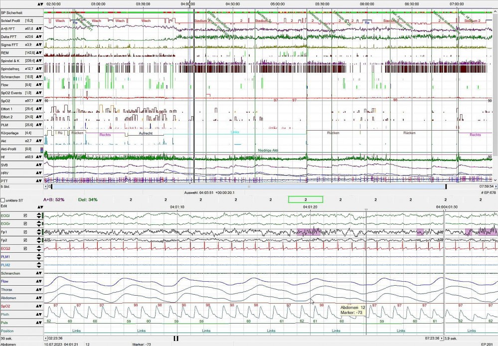 Das extrem kleine und leichte Gerät "SOMNOtouchRESP" des deutschen Herstellers SOMNOmedics zeichnet in einer Untersuchungsnacht (bis zu 14 Stunden) die Körperlage, den Aktivitätsgrad, die thorakalen und abdominalen Atemexkursionen, die Herzfrequenz, die Blutsauerstoffsättigung, den Atemfluss einschließlich der Atemanstrengung und der Atemstörungen sowie das Schnarchen auf. Die anschließende computergestützte Auswertung in der Praxis ergibt ein erstes Bild Ihrer Schlafsituation. Neben den 8 polygraphischen Standardableitungen können bei bestimmten Fragestellungen auch zusätzliche Sensoren zur Erfassung der Schlafstadien über die Hirnstromableitungen und Augenbewegungen, des EKG, periodischer Beinbewegungen, des interkostalen Elektromyogramms sowie zur manschettenfreien Aufzeichnung des Blutdrucks über die Puls Transit Zeit (PTT) angelegt werden. Diese Ergänzungen ermöglichen nach einer überwiegend manuellen Auswertung der gesamten Schlafaufzeichnung durch den Arzt eine detaillierte Beschreibung der möglicherweise bestehenden Schlafstörung und eine diagnostische Einordnung nach der ICSD-3 (Internationale Klassifikation der Schlafstörungen). Ist dies in bestimmten Fällen einmal nicht mit Sicherheit möglich, erfolgt die Vorstellung in einem Schlaflabor zur weiterführenden Diagnostik und ggf. einer anschließenden Behandlungseinstellung.