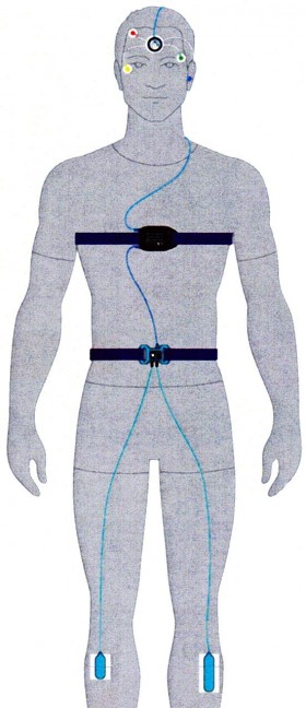 unten links: Sensoren zur Ableitung der Hirnströme, der Augenbewegungen und der Muskelpotentiale an den Beinen unten rechts: vollständige Hirnstromableitungen