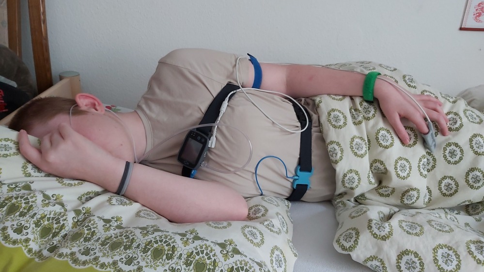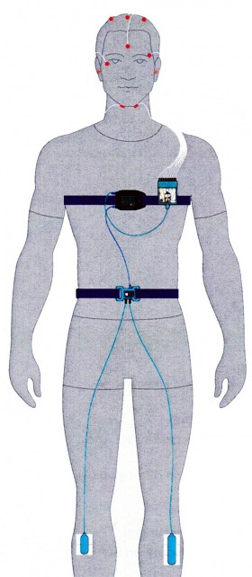 oben links: Anlage der Sensoren für eine Polygraphie, so genanntes "kleines Schlaflabor" oben rechts: Erweiterung mit Ableitung des EKG