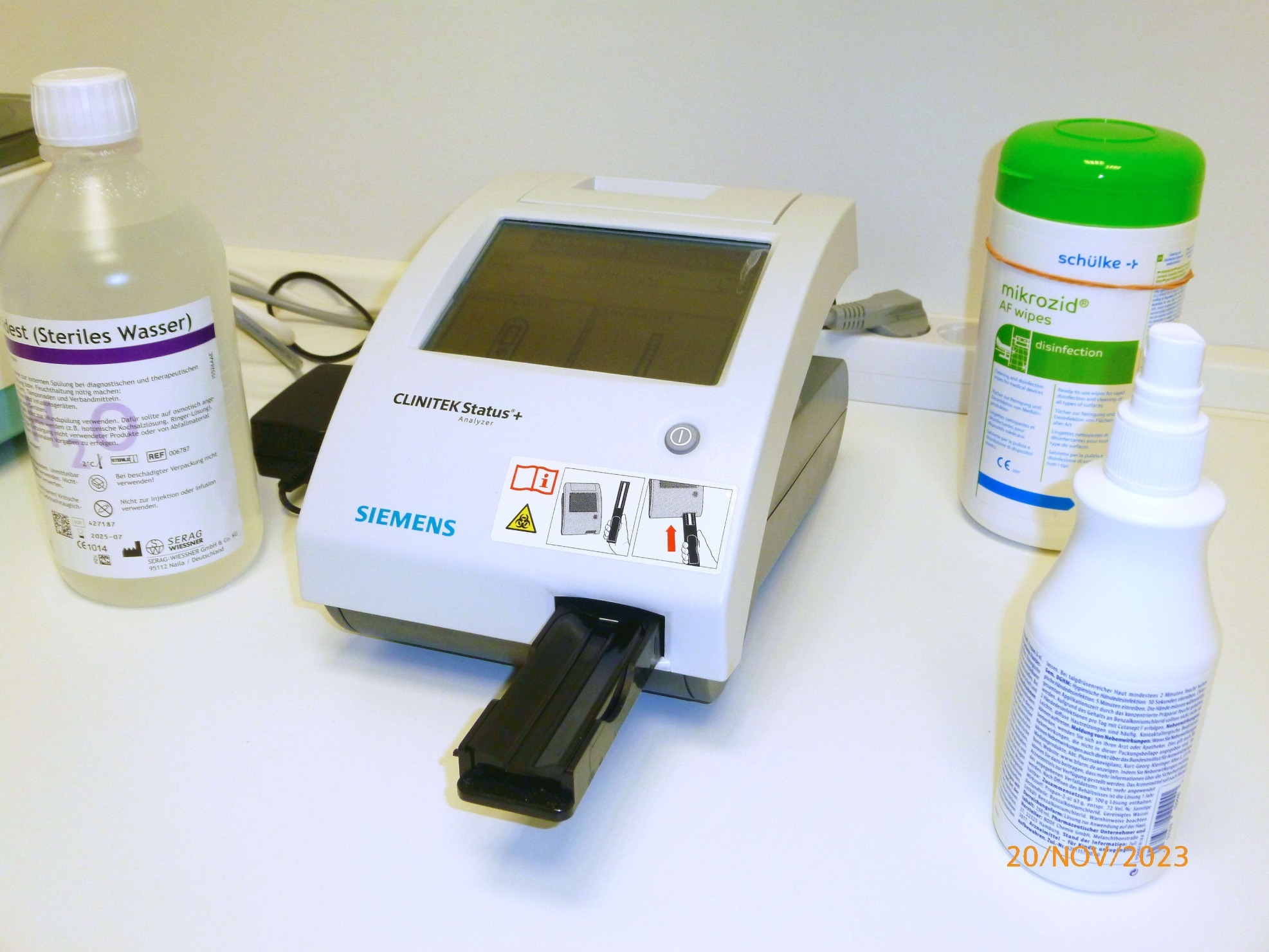 Die chemische Analyse von Urin erfolgt mittels gebrauchsfertiger Teststreifen, sogenannter Indikatorstreifen. Dabei handelt es sich um Kunststoffstreifen mit kleinen Papierquadraten, die mit Chemikalien getränkt sind. Wird der Streifen in den Urin getaucht, ändert eine chemische Reaktion die Farbe des Papierquadrates. Der Farbumschlag wird mit einer mit den Teststreifen mitgelieferten Farbskala verglichen, um das Testergebnis zu ermitteln. Die Analyse der verwendeten Clinitek-Multistix-Harnteststreifen und der Albumin-Kreatinin-Teststreifen erfolgt bei uns mittels automatischem Analysesystem CLINITEKstatus+ der Fa. Siemens. Gestestet werden: spezifisches Gewicht, pH-Wert, Proteingehalt, Glukosegehalt, Ketonkörper, Blut, Nitrit, Leukozyten, Kreatinin und Albumin.